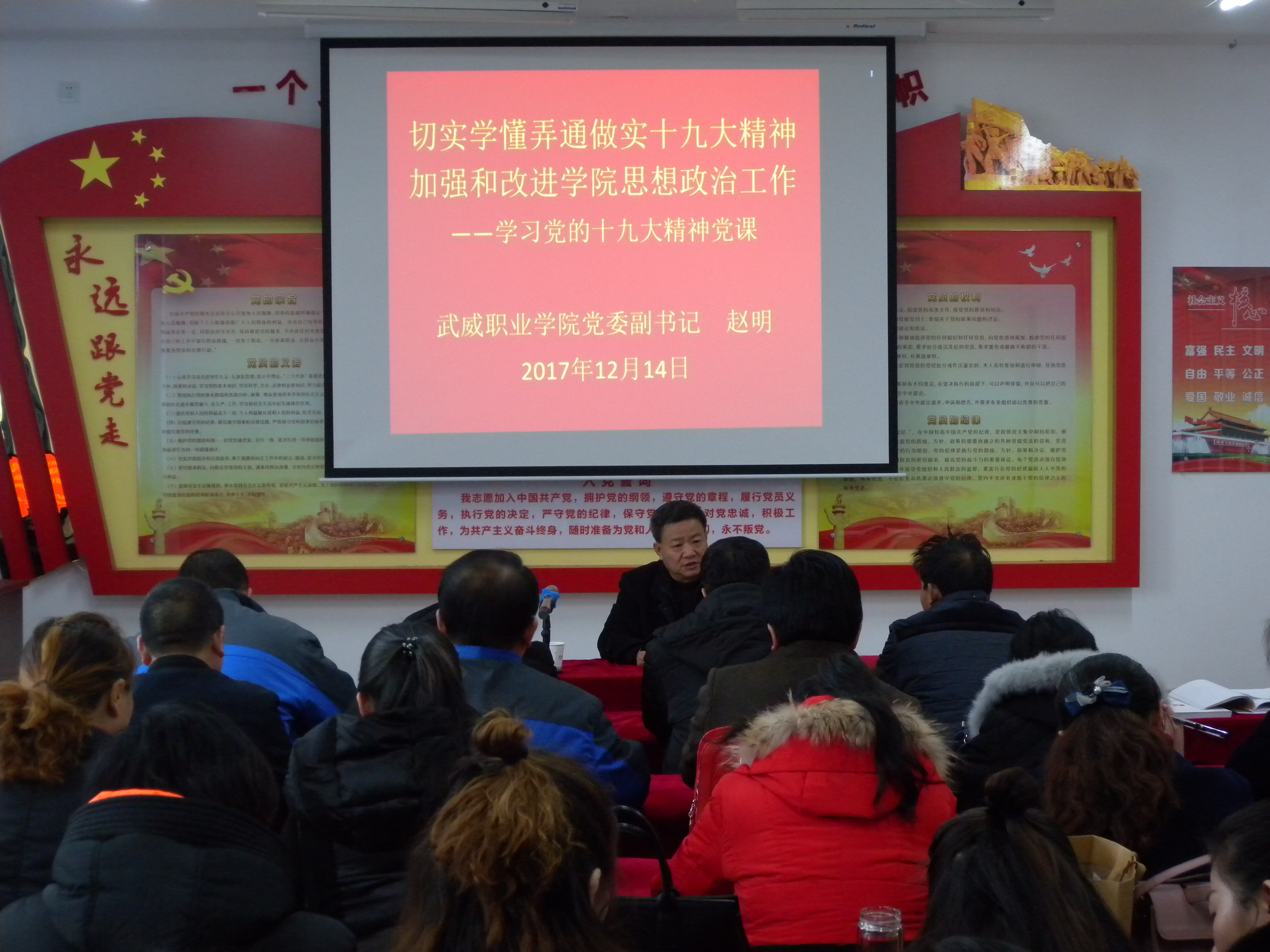 12月14日下午,人文藝術(shù)教育系黨總支邀請(qǐng)學(xué)院黨委副書(shū)記趙明同志到我系、馬克思主義學(xué)院講黨課,趙明同志結(jié)合自身學(xué)習(xí)十九大及習(xí)近平總書(shū)記在全國(guó)高校思想政治工作會(huì)議上的講話精神體會(huì),做了題為《切實(shí)學(xué)懂弄通做實(shí)十九大精神? 加強(qiáng)大學(xué)生思想政治工作》的黨課,全體教師聆聽(tīng)了黨課。