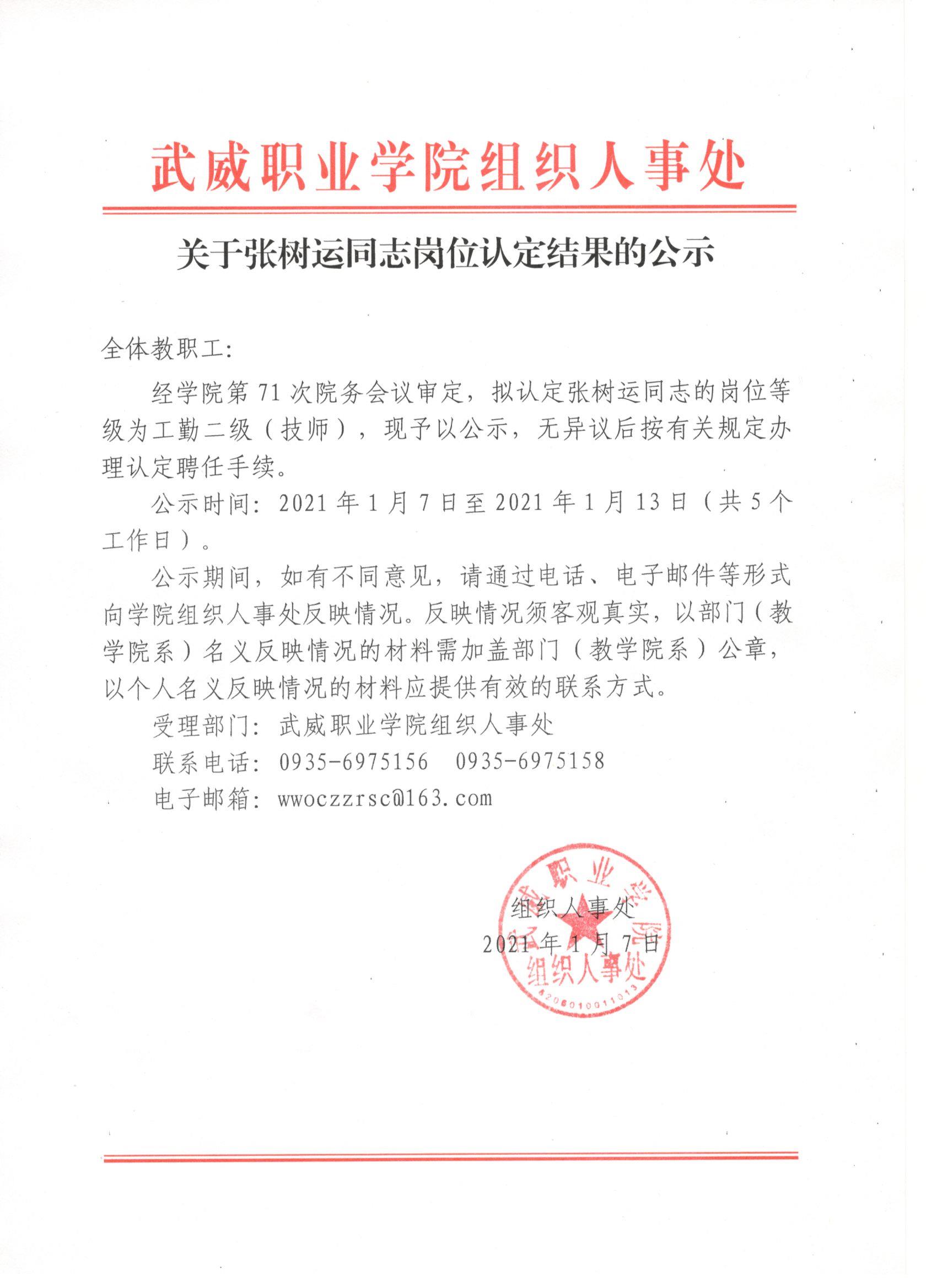 關(guān)于張樹運(yùn)同志崗位認(rèn)定結(jié)果的公示