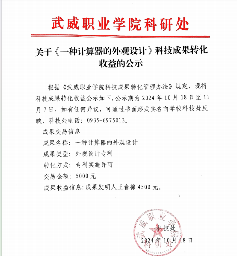 關于《一種計算器的外觀設計》科技成果轉化收益的公示