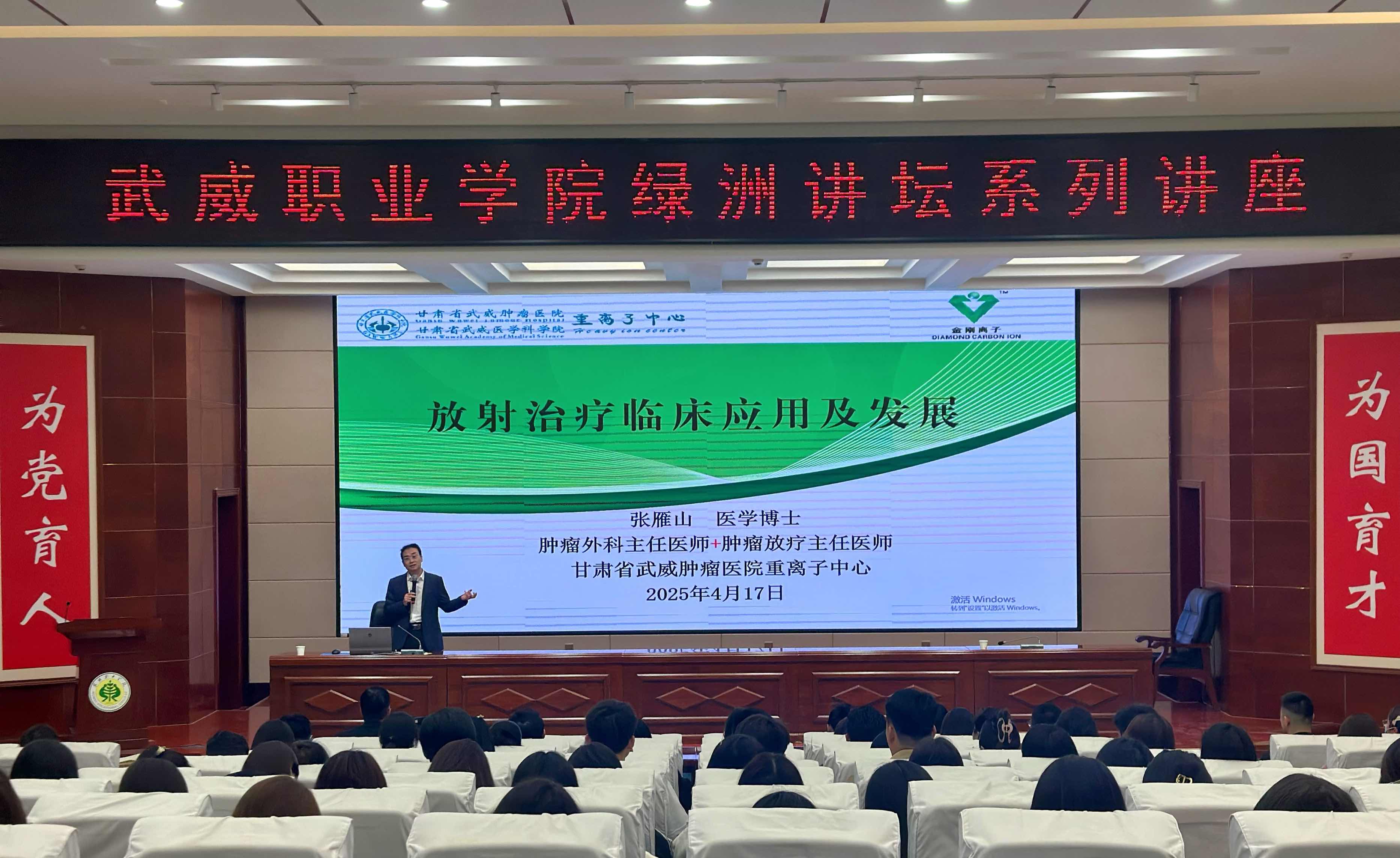 4月17日,學(xué)校特邀甘肅省武威腫瘤醫(yī)院副院長(zhǎng)、重離子中心主任張雁山博士,在菁英廳作了“放射治療臨床應(yīng)用及發(fā)展”專題講座。學(xué)校黨委副書記翟存祥主持講座,醫(yī)學(xué)技術(shù)學(xué)院、藥學(xué)院、護(hù)理學(xué)院教師,2024級(jí)放射治療技術(shù)專業(yè)學(xué)生共210余人聆聽了講座。