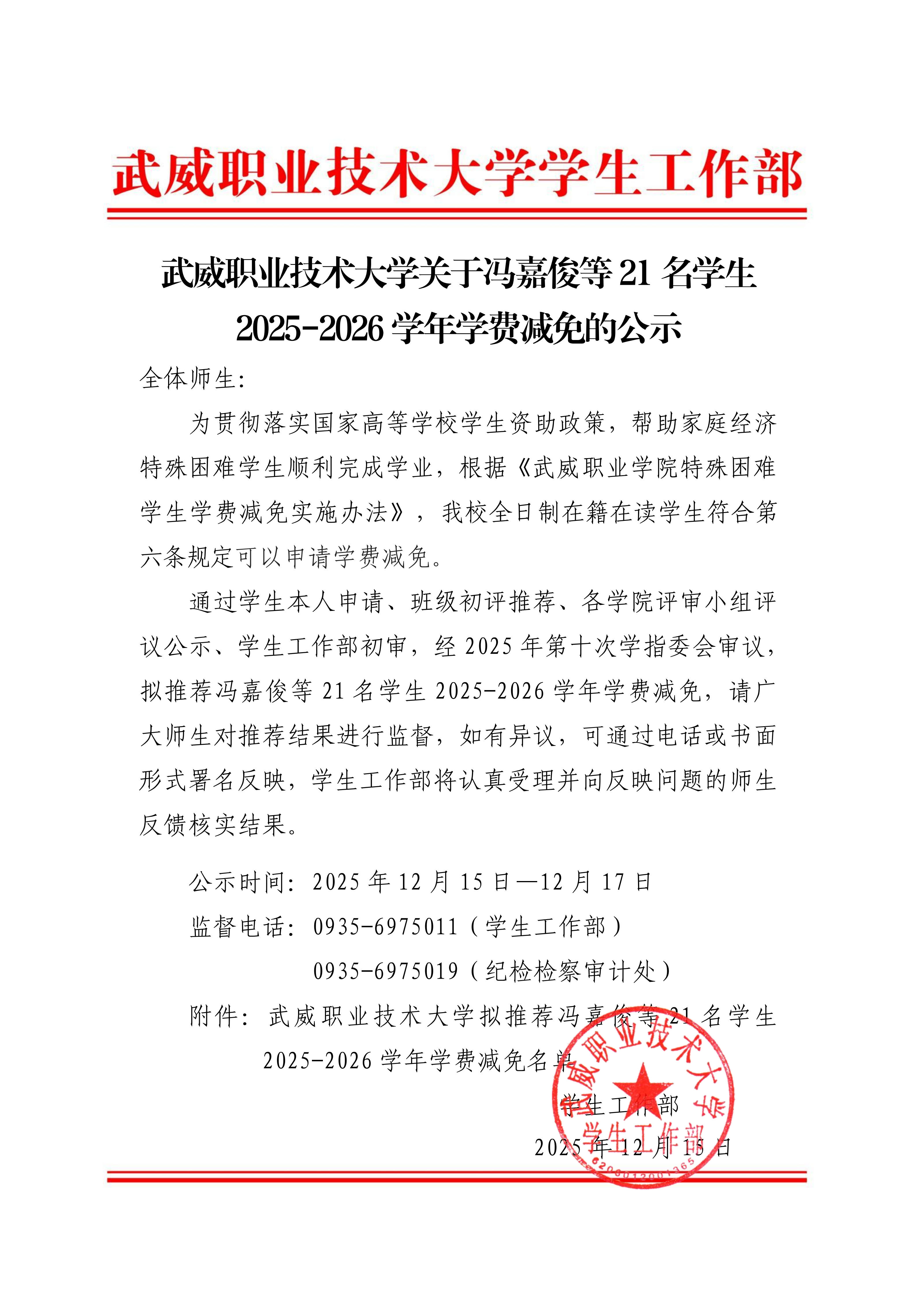 武威職業(yè)技術大學關于馮嘉俊等21名學生2025-2026學年學費減免的公示