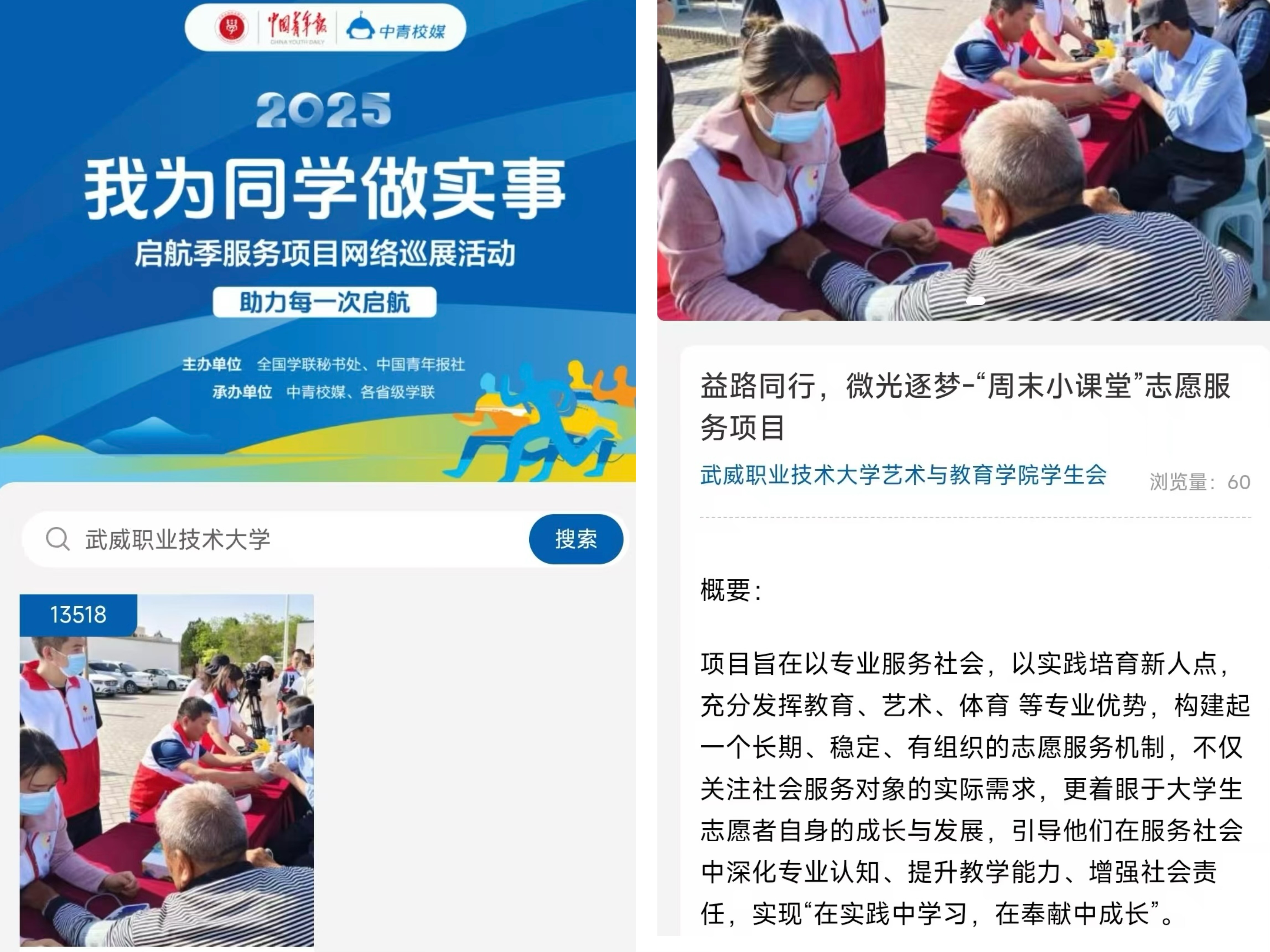 近日,由共青團中央指導(dǎo),全國學(xué)聯(lián)秘書處與中國青年報、中青校媒聯(lián)合發(fā)起的全國高校學(xué)生會組織“我為同學(xué)做實事”啟航季服務(wù)項目網(wǎng)絡(luò)巡展活動公布入選名單。藝術(shù)與教育學(xué)院學(xué)生會申報的“益路同行,微光筑夢”周末小課堂服務(wù)項目從全國896所院校的1662個項目中脫穎而出。