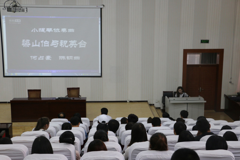 伴著優(yōu)美的音樂旋律王敏副教授開始了講座,王老師首先介紹了音樂發(fā)展歷史和音樂鑒賞的基礎(chǔ)知識(shí),然后以我國(guó)著名作曲家陳鋼、何占豪先生創(chuàng)作的小提琴協(xié)奏曲《梁山伯與祝英臺(tái)》為題材,分階段講述了“鳥語花香”、“草橋結(jié)拜”、“英臺(tái)抗婚”、“投墳化蝶”等內(nèi)容和藝術(shù)場(chǎng)景。剖析了作品在管樂、和以小提琴、大提琴為主的弦樂及民樂有機(jī)結(jié)合的高超藝術(shù)境界,講座過程中王老師結(jié)合《梁?!穮f(xié)奏曲音視頻資料,演繹了梁山伯與祝英臺(tái)凄美的愛情故事。