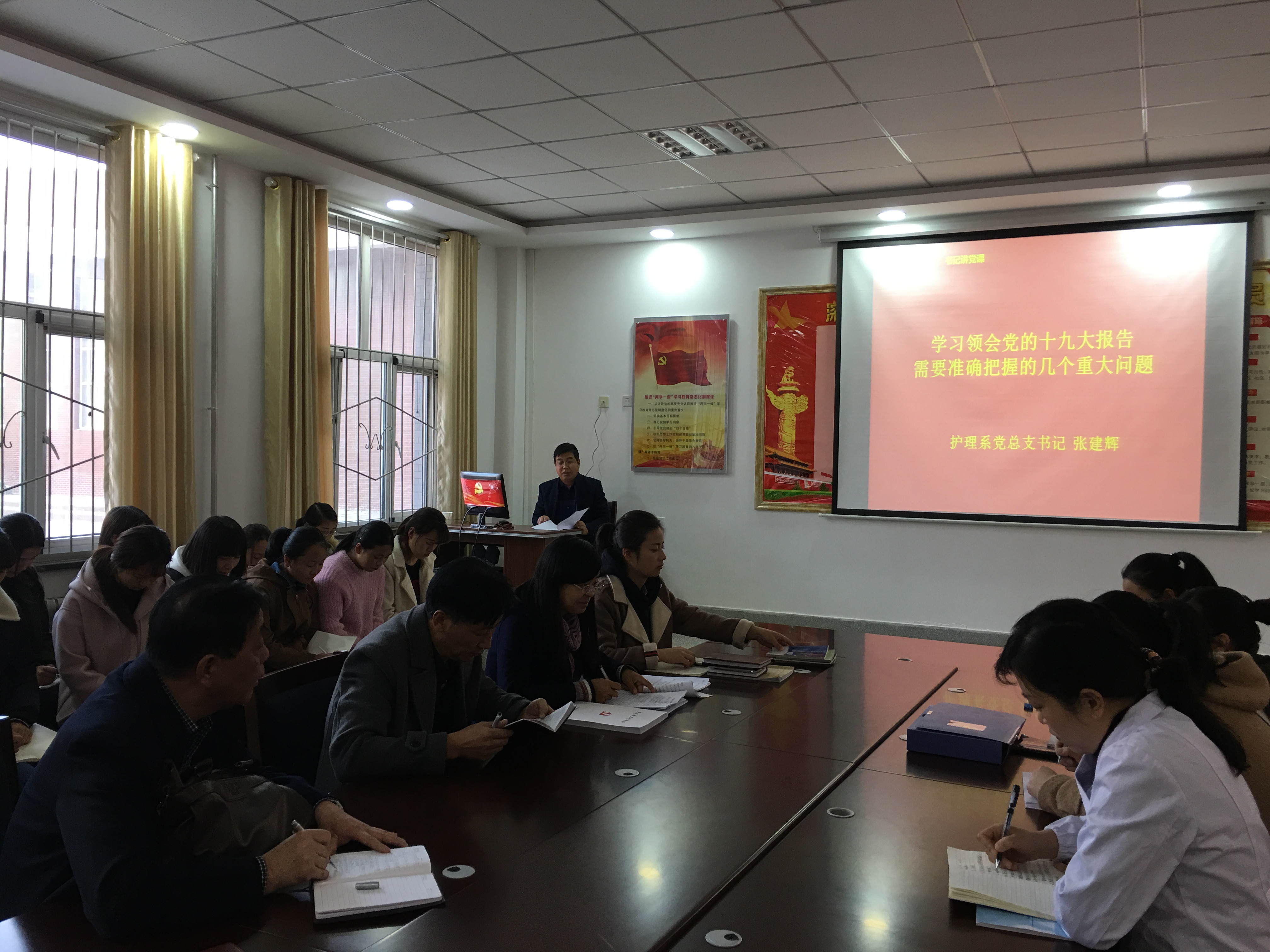 11月17日,護理系黨支部支召開全體黨員大會,黨總支書記張建輝講黨課,就《學(xué)習(xí)領(lǐng)會黨的十九大報告需要準(zhǔn)確把握的幾個重大問題》進行專題黨課輔導(dǎo),促進全體黨員對十九大精神的學(xué)習(xí)理解。護理系入黨積極分子聆聽了黨課。