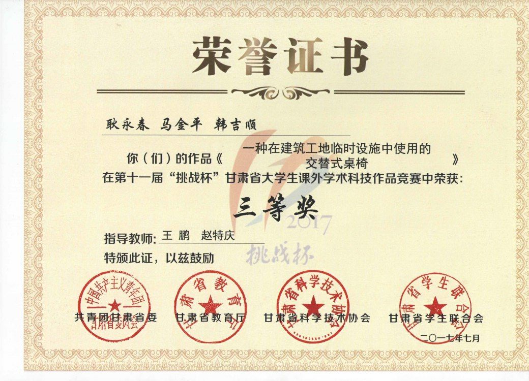 第十一屆“挑戰(zhàn)杯”甘肅省大學生課外學術科學作品《一種在建筑工地臨時設施中使用的交替式桌椅》