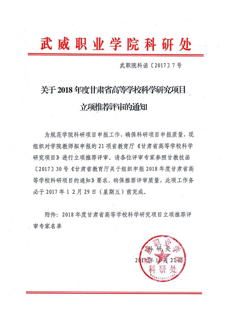 關于2018年度甘肅省高等學??茖W研究項目立項推薦評審的通知