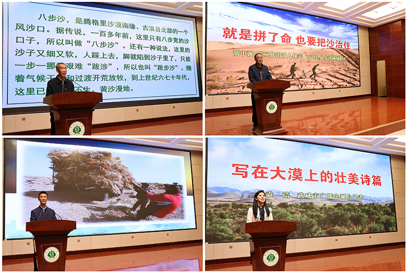 報(bào)告會(huì)上,二代治沙人代表、八步沙林場(chǎng)場(chǎng)長郭萬剛,二代治沙人代表、八步沙林場(chǎng)職工賀中強(qiáng),三代治沙人、八步沙林場(chǎng)管護(hù)員郭璽、武威市廣播電視臺(tái)記者袁潔,分別從綠色承諾、使命責(zé)任、接續(xù)奮斗、記者見證等不同角度、不同側(cè)面,生動(dòng)再現(xiàn)了“六老漢”三代人治沙造林持續(xù)改善生態(tài)環(huán)境、讓沙漠披綠生金的感人事跡。在場(chǎng)師生無不為“六老漢”三代人的感人事跡深深震撼,紛紛表示要學(xué)習(xí)和繼承“六老漢”三代人困難面前不低頭、敢把沙漠變綠洲的奮斗精神,為建設(shè)美麗中國、實(shí)現(xiàn)中華民族永續(xù)發(fā)展貢獻(xiàn)自己的青春力量。