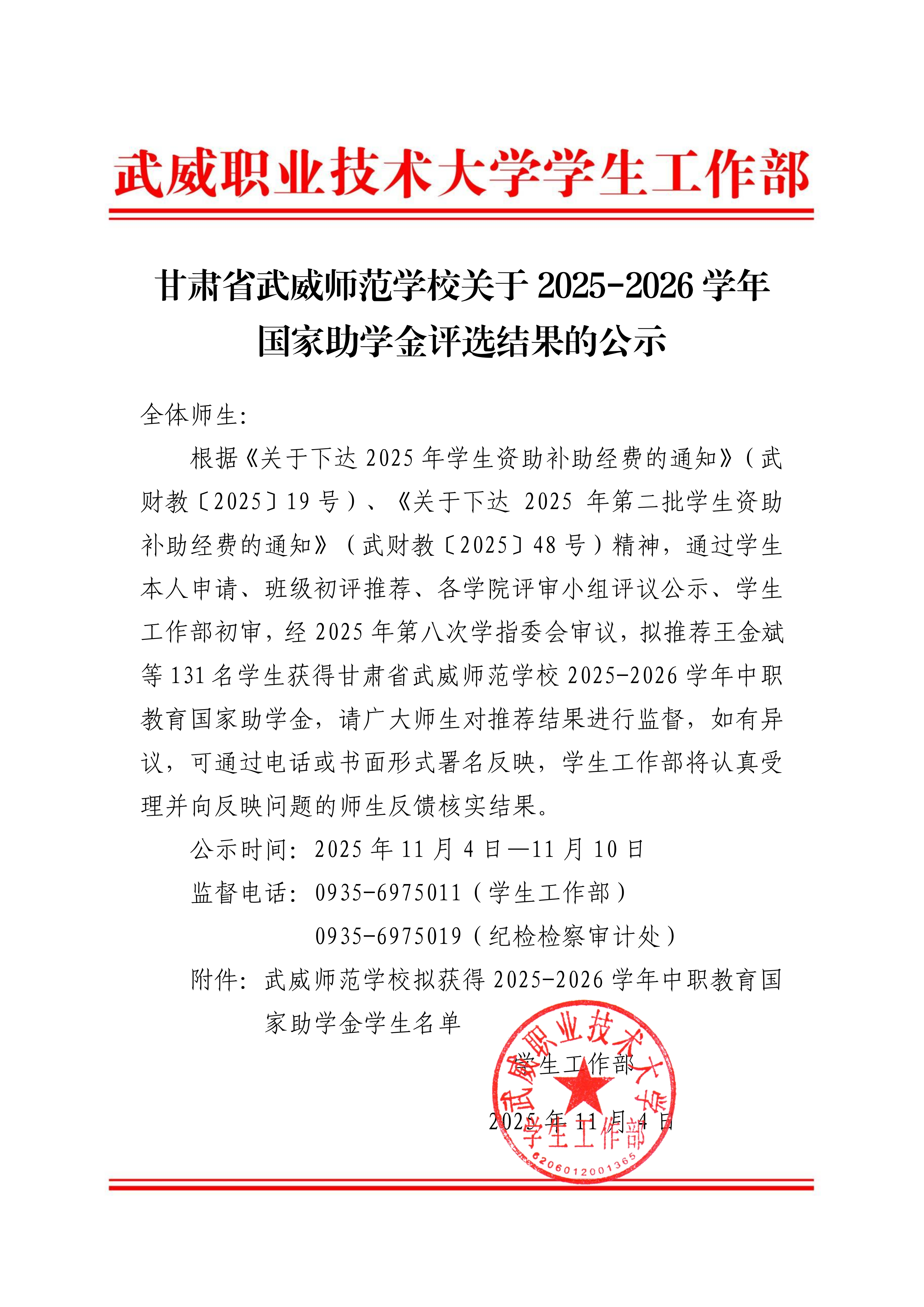 甘肅省武威師范學(xué)校關(guān)于2025-2026學(xué)年國家助學(xué)金評選結(jié)果的公示