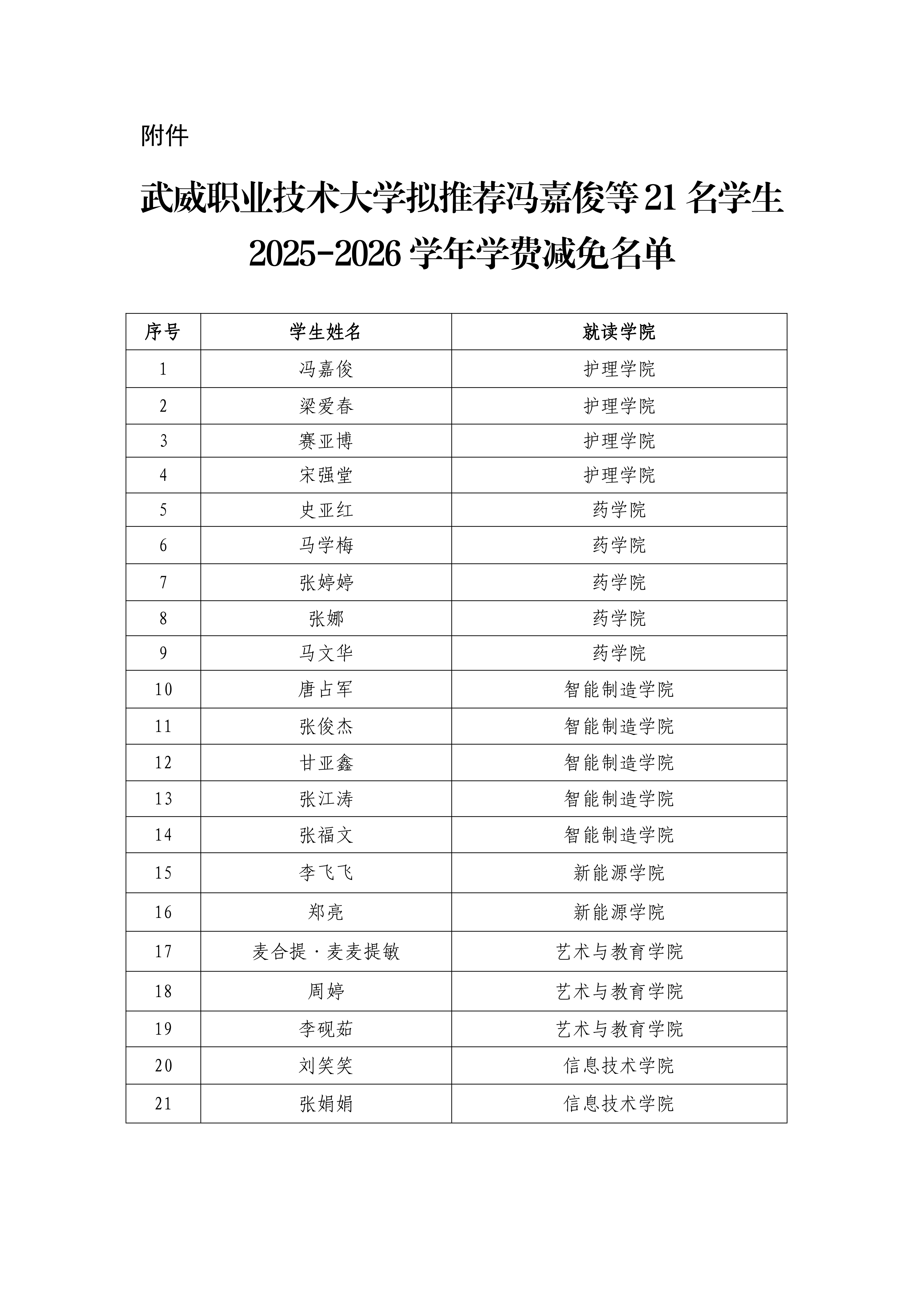 武威職業(yè)技術大學關于馮嘉俊等21名學生2025-2026學年學費減免的公示