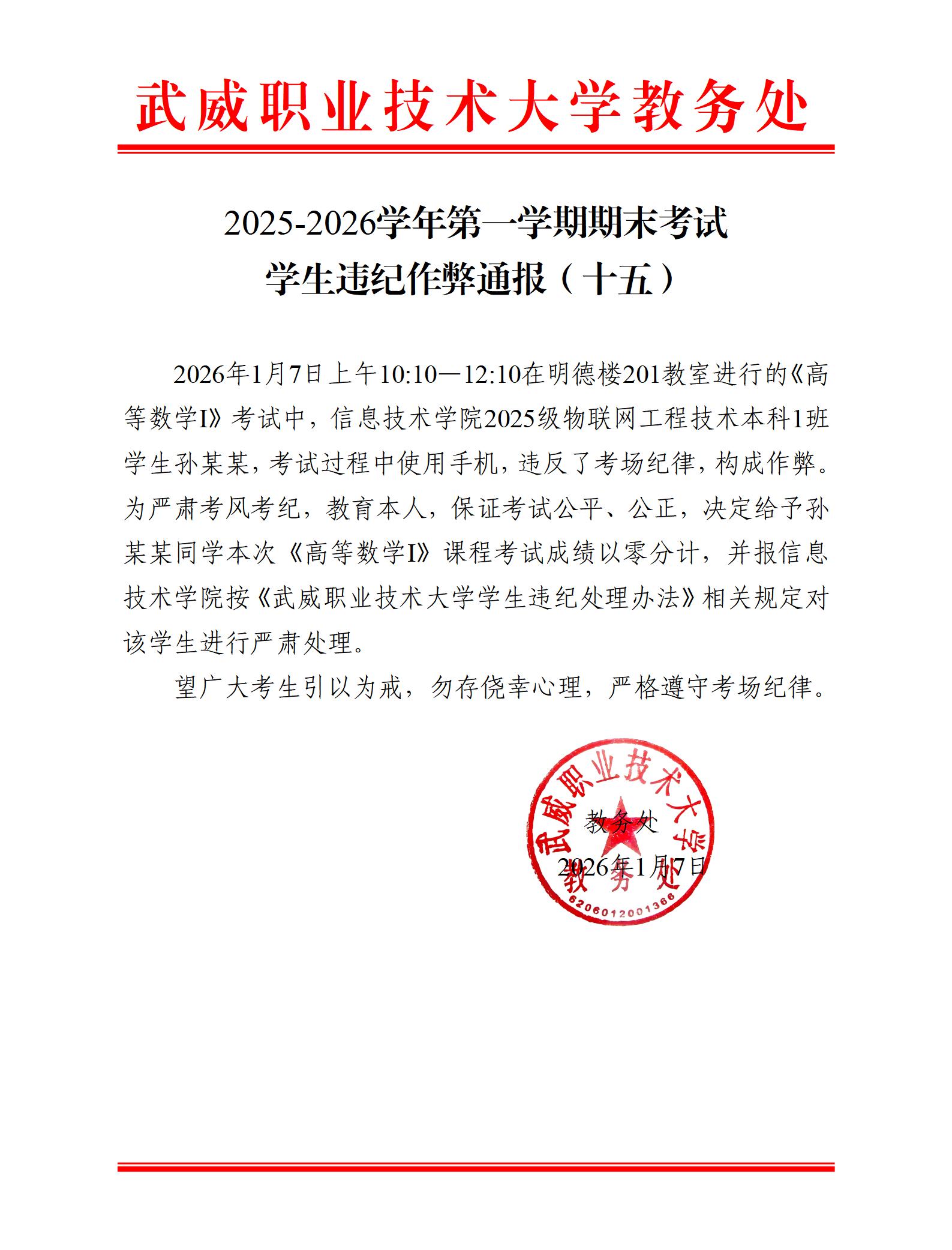 2025-2026學(xué)年第一學(xué)期期末考試學(xué)生違紀(jì)作弊通報(十五)