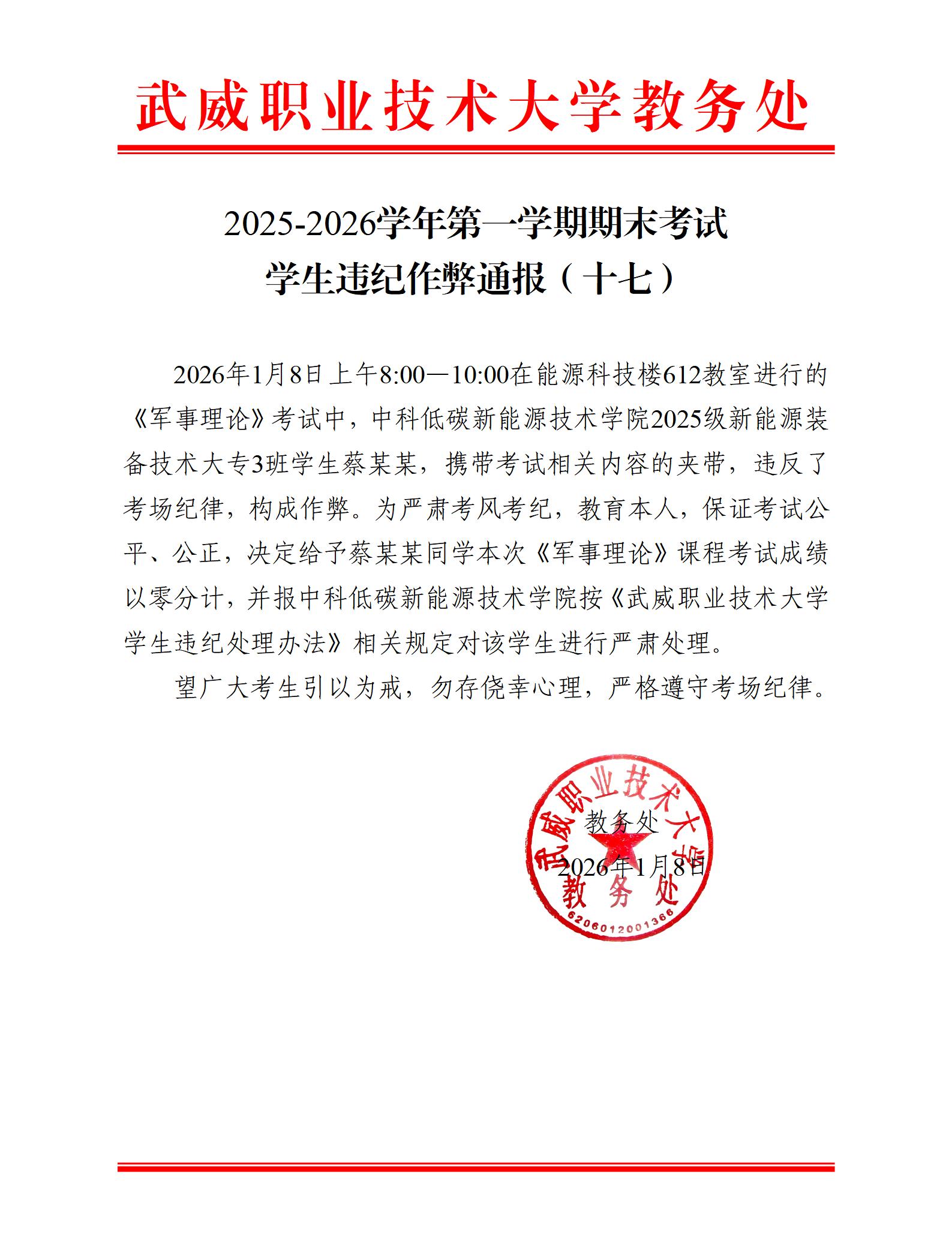 2025-2026學年第一學期期末考試學生違紀作弊通報(十七)